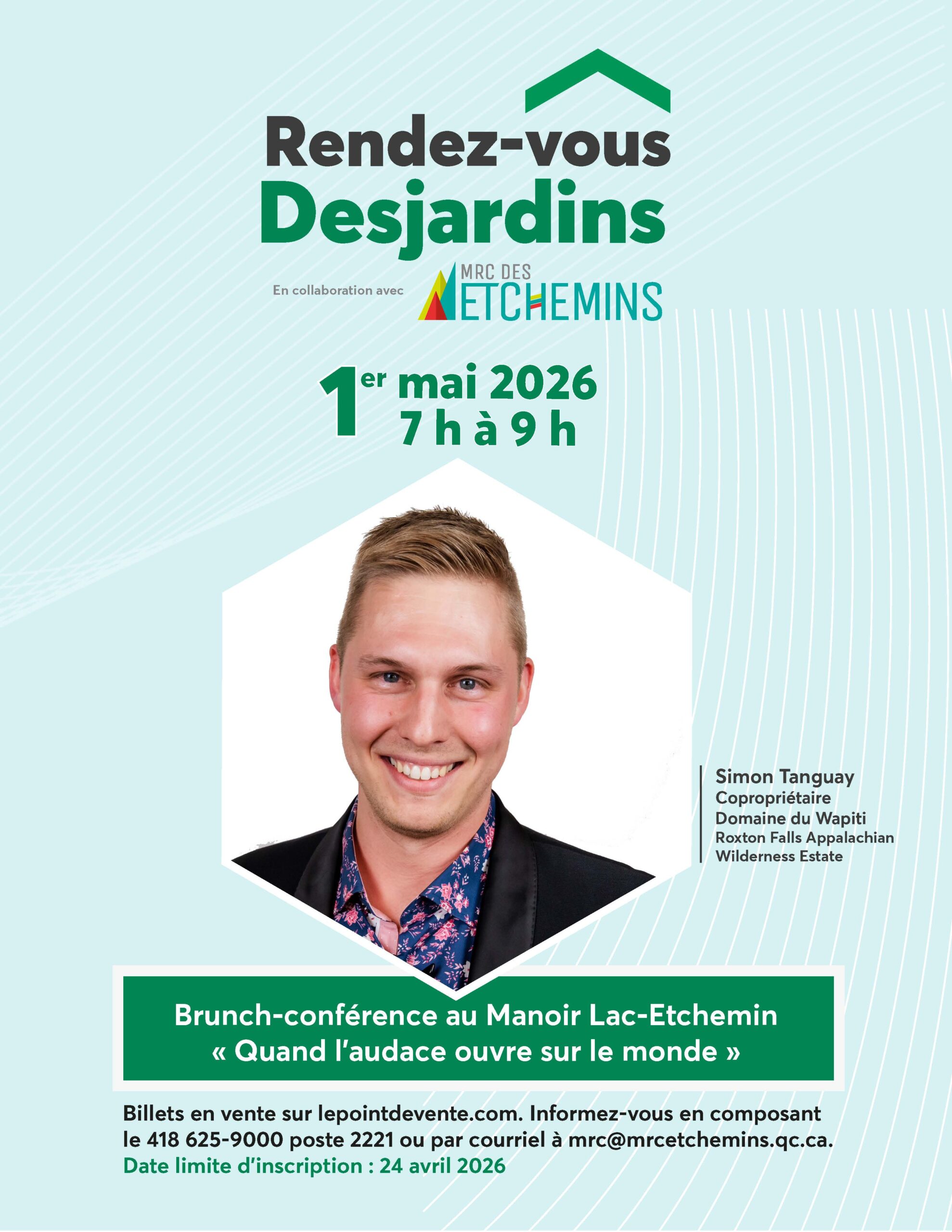 Le brunch-conférence, qui invite les entrepreneurs à une rencontre inspirante sous le thème « Quand l’audace ouvre sur le monde », mettra en vedette M. Simon Tanguay, copropriétaire du Domaine du Wapiti Roxton Falls Appalachian Wilderness Estate.