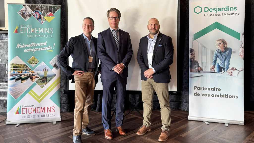 Sur la photo : Pierre-Olivier Gauthier, directeur du service de développement économique à la MRC des Etchemins, M. Jean-René Ouellet, stratège d’investissement et gestionnaire de portefeuille chez Desjardins et M. Benoit Carriere, directeur général et représentant en épargne collective pour Desjardins, Caisse des Etchemins