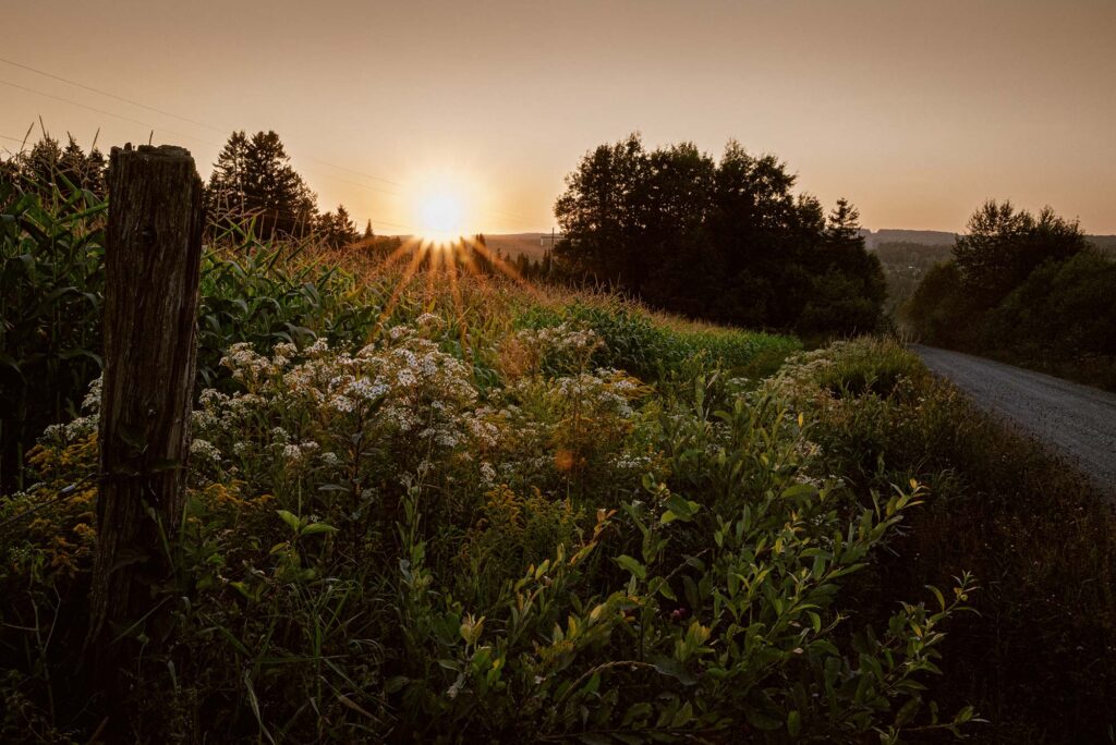 Description : À l’heure dorée, sous un soleil voilé dû aux feux de forêts de l’Ouest, le champs de maïs baignait dans la lumière chaude et orangée de la mi-août. Plein feu sur la richesse de l’agriculture dans notre région.