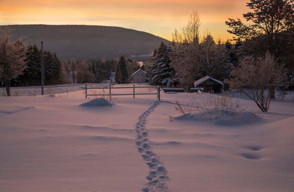 Description : Matin froid de la fin décembre. Pendant cette période où les journées sont courtes, le soleil se lève derrière le morne à Giroux laissant paraître une lumière violacée qui souligne un léger frimas sur les arbres ainsi que sur la neige fraîche.